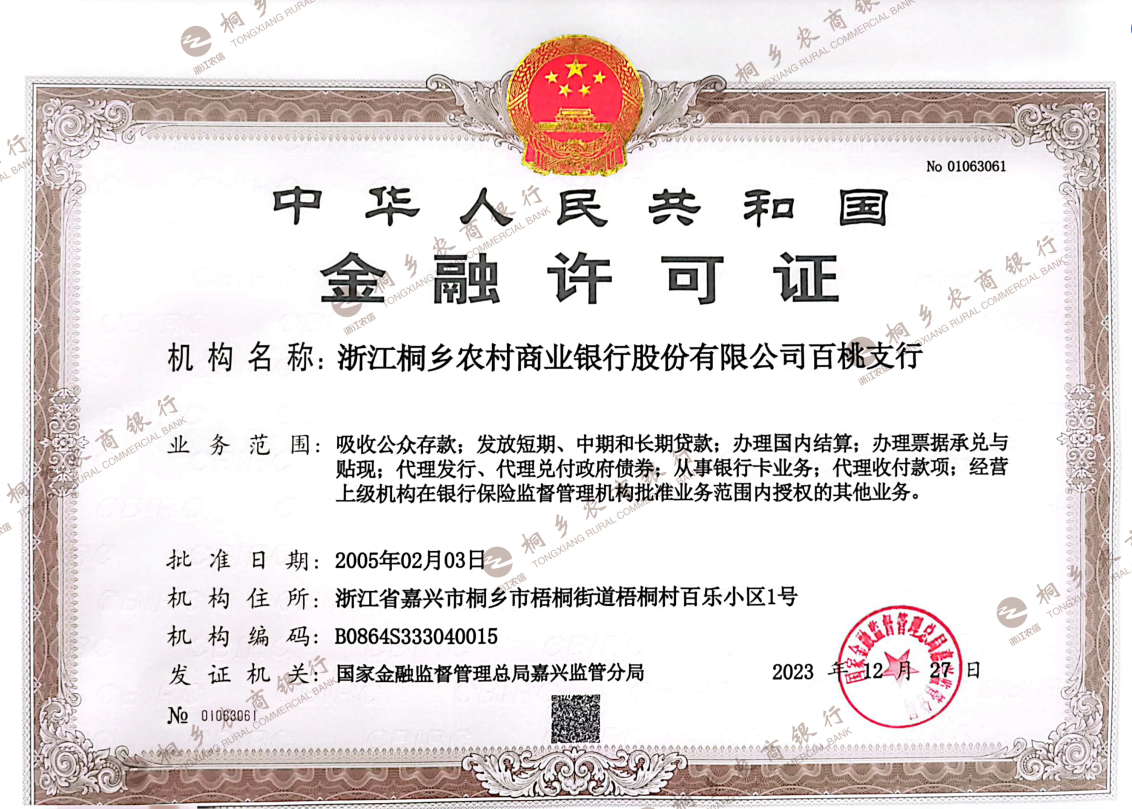 机构名称:浙江桐乡农村商业银行股份有限公司百桃支行 机构编码:B0864S333040015 业务范围:吸收公众存款;发放短期、中期和长期贷款;办理国内结算;办理票据承兑与贴现;代理发行、代理兑付政府债券;从事银行卡业务;代理收付款项;经营上级机构在银行保险监督管理机构批准业务范围内授权的其他业务。 批准成立日期:2005年2月3日 住所:浙江省嘉兴市桐乡市梧桐街道梧桐村百乐小区1号 电话:0573-88810615 发证机关:国家金融监督管理总局嘉兴监管分局 发证日期:2023年12月27日